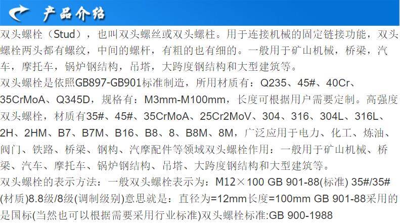 产品详情:在装饰领域,它一般而言用于大跨度的钢结构和大型构筑物。它用于固定链节,两边都有螺纹,中间有一个螺钉。双头螺栓既粗又细,并且有许多标准和标准化。固定链节功用用于连通机械。双头螺栓的两边都有螺纹,中间的螺钉又细又粗。称谓为:直杆/缩杆,也叫做双头螺钉,一般而言用于矿山机器,桥,汽车,摩托车,锅炉钢结构,吊塔,大跨度钢结构和大型建筑等。在模具行业中,一般而言可以达到8.8的高强度双头螺栓,也可以定制12.9的高强度双头螺栓(但与之配套采用的对接螺母,加厚螺母和t形螺母应调整为高强度)。
